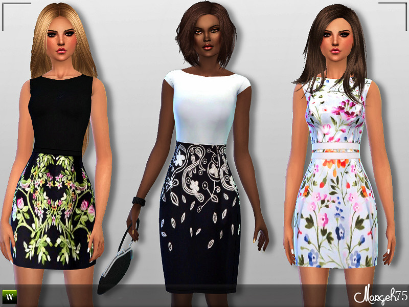-A beautiful set of fashionable dresses that contains -a beautiful formal crop top attached to floral skirt for your high fashion sims who want to look gorgeous and classy and A file with 2 beautiful dress variations of white dress with florals and double white waist bands and a black skater dress with attached floral skirt.